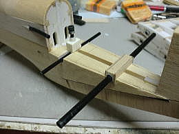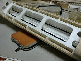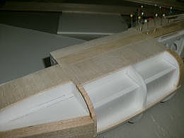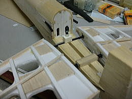 ● 機首側胴体下部のプランク状況です。本来60クラスのグローエンジンが搭載されて重心が合わせ易くなるノーズモーメントなのに、エンジンの代わりにラジメカを集中して詰め込んで重心を取ろうとする訳だから、遠慮も躊躇も要りません!。堂々とハード系の分厚いバルサをビシバシ貼り込みましょう。尚!本機の兄弟機にブラシレスモーターを搭載してグランド機に・・・を目論んだモデラーさんが大失敗しました(笑)・・・。毎分3万回転するブラシレスモーターを搭載したら、手投げ上昇中にノーズ付近がバラバラに分解・・・。そりゃそうでしょうなあ・・・。本機は無動力の設定・・・其れを無理やり動力機にするんだもの・・・スチレンのボックス構造だけで強度が持つはずが無いですよ。見た目の状況だけで判断しちゃうから失敗します。バラけない様にマイクログラスでも巻けば良かったのに、軽量化と称してオラライトでカバーリング・・・。此れじゃあ、ブラシレスモーターの振動に耐えられないでしょうなあ・・・。