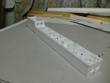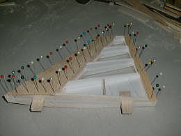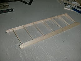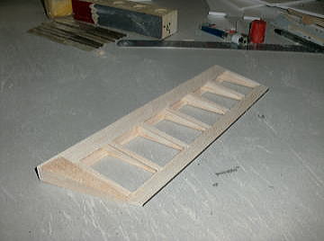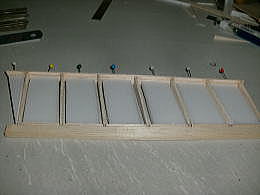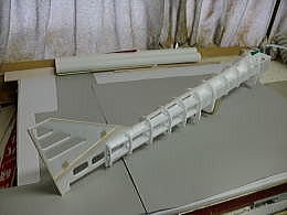 ● ラダーを作ります。スチレン板を治具にしてバルサオンリーでラダーの構造体を完成させる手順です。スチレン材の小口に貼り込んだバルサ材には、幅2mmの溝を入れます。此れがスロットインの溝に成ります。このバルサ面にもう一枚バルサ棒材を接着すると、此れが前縁材と後縁材に成ります。中芯のスチレン材を取り付けるリブよりも少々広く切り取ります。リブ材を貼り込んだら、接着剤硬化後に残りのスチレン材も取り去れば正確に組まれたラダーの構造体の出来上がりです・・・。リブ組動翼なら全面使えますよ。