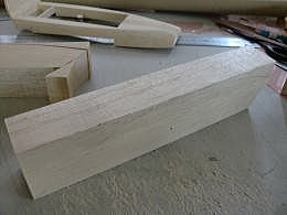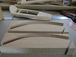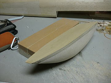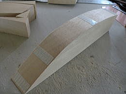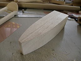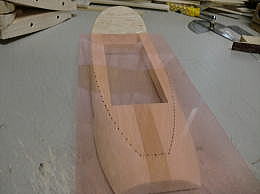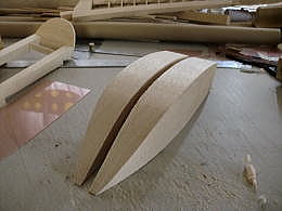 ● 直方体に戻したら、上記で作った透明のテンプレートを使って、上面図から見たアール面をトレースして切り抜いていきます。すると画像の様な複雑なブロックが出来ます。此れを左右接着するんですが、この時にブロックの間に側面形に切り抜いた2mmのベニヤを挟み、小口をマジックで塗り潰してからブロックと一緒にエポキシで接着します。実は・・・大手のメーカーにバキュームを頼むと、必ず言われるんですけど・・・このベニヤは挟むな!って言われます。目止めの溶剤の塗布の時に中々埋まらないからです。しかし・・・ネット普及と共に、初心者さんでも見様見真似で木型を作っちゃう時代に成りました。基準が無いと削り過ぎて大失敗!・・・説明が甘い!って頓珍漢なメールが来たりするんですなあ・・・。一回の削りでキャノピーの木型が正確に作れる訳無いじゃないですか!・・・。中華のフィルム張り完成機ばっかり作ってるから、何でも簡単に作れる!って誤解してるんじゃないかなあ・・・。