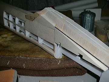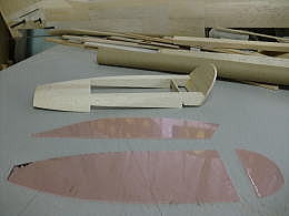 ● 加藤無線(MK)の60クラスグローのブルーエンジェルのキットを組まれたモデラーなら、何とまあ・・・複雑な組み方してんなあ・・・って思ってるでしょうねえ・・・。バルサキットを刻んで部品にしていた私自身も同じ事思ってます(笑)・・・。バルサキットのこの垂直尾翼下部の状況・・・糸鋸盤と昇降盤で複雑に加工されたワンピースのバルサブロックだけで作られていましたので・・・。でも本機は無動力のグライダー・・・軽量化しないとテールヘビー確定なんですよねえ・・・。だから泣く泣く、こんな複雑な構造に成りました。まるで合わせ木細工ですなあ・・・。でも・・・本機オリジナルバルサキットに比べたら、35%程度のバルサブロックで済んでます。