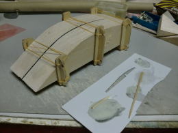 ● 通常のバルサキットとはプランクの仕方が異なる胴体です。複雑なアール面が混在する場合は、同枠毎にプランクシートを貼り込みます。この貼り方は自作のスケール機に多いんですが、沢山のストリング材(縦通材)を入れると問題は起き難いんですが・・・模型機の場合、入れるストリング材にも本数に限界が有るので、誰でも経験する問題点が露見します。其れは胴枠上のプランクシートを境にプランク面が波打ってしまう事です。アール面を含むと接着剤の硬化と共にプランク面が凹んでしまいます。