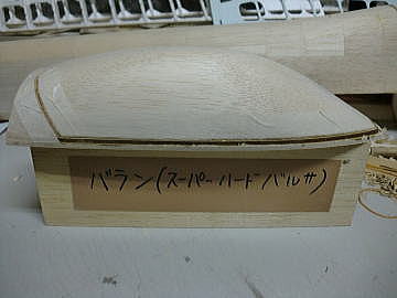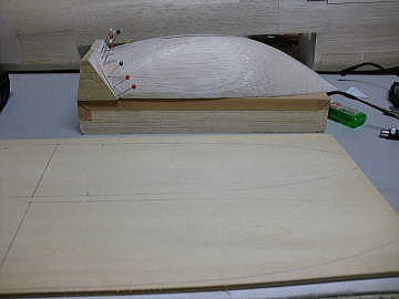 ● このバルサの木型の高さはまだキャノピーの必要寸法です。この下に捨てる切り代分を作らないと、必要寸法のキャノピーの成型品は採れないんです。仮になにも貼らなかった場合・・・吸着が甘くて木型の底が大きくアール上になった場合、アールを避けて切り出すと高さの寸法が足らなくなるんですなあ・・・。だから吸着が甘くなっても良い様に、切り代分を嵩上げするんです。