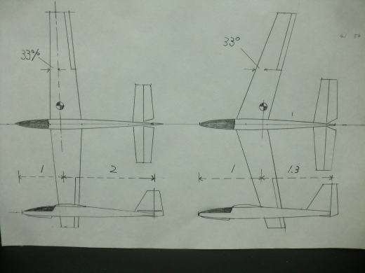 ● 胴体は同じ設定なので、重心位置からの機首側が長くなった分・・・尾翼側が短く成りました。この位置関係で前後のモーメントの吊りあいを取る為には、尾翼の面積を増やさなくてはなりません。テールモーメントが短くなったので小さい垂直尾翼のままでは、ヨー軸の直進安定性が悪く成ります。よって垂直尾翼も大きくする必要があります。三番目の機体は更に主翼が後退したので、重心位置も後退します。よってノーズ側モーメントとテール側モーメントの比率がひっくり返ってしまいました・・・。尾翼は更に大きくしないとヨー軸とピッチ軸の吊り合いが採れずに直進安定も悪く成ります。水平尾翼に至っては・・・最早水平尾翼の単純構造では持たない位に大きくなっていますし、細い胴体でこのサイズをガッチリ保持する事は難しく成りました・・・。