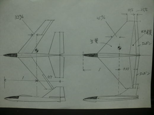 ● だったら主翼の後縁と水平尾翼の前縁を合体して、一枚翼にすれば頑丈に成る!って考えたのが無尾翼機と言われる形状の飛行機です。無尾翼機の場合は平均翼弦の前縁から25%位置が重心の基準と聞き・・・ネット物知り博士は頭がこんがらがります(笑)・・・。翼全体を翼弦から四等分すると、前縁側75%までが主翼・・・後縁側の残り25%が水平尾翼の扱いです。重心位置から見れば、水平尾翼付きの三番目の機体よりも・・・もっとテールモーメントが短くなっています。よって垂直尾翼は更に大きく設定しなければなりません。そうしないとヨー軸の直進安定性が悪くなるからです。