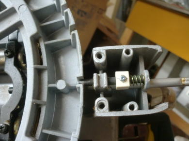 ● この解除ピンは後方に5mm程しか動きません。スライド用のホルダーが二か所なので、平行にスライドします。本体がダイキャスト・・・スライドのピンは焼き入りのシャフトなので、金属の硬度から言えばピンの方が硬いです。よってスライドするホルダー側のダイキャストにはグリス等を盛っておけば動きが渋く成る事は無いんですけどねえ・・・。ただこの解除機能・・・レバーを押巣動作の時に、押す力の加減で多分摩耗頻度が変わってしまうんですなあ・・・。切削するのは木材なんですが、ムクの木材やら合板やらと多種多様なんですが、特に硬い材質の合板の場合、木材の切りカスに混じって接着剤の粉も混じったりするんですが、此方の粉の方が小さいので・・・此れがシャフトのグリスに付着するとピンのスライドを妨げるんですなあ・・・。其れが丸鋸の解除レバーに不必要の荷重を与える結果とも言える・・・。多分・・・メーカー側でも販売後のユーザー側からの苦情で一番多い事例ではないでしょうか・・・。このレバー・・・ジュラコン製なんですが、この段付けの部分・・・真ん中が凹んでるでしょう?・・・此処が摩耗しているので、ピンに打ち込まれたスライド用のピンが動かなくなりました。