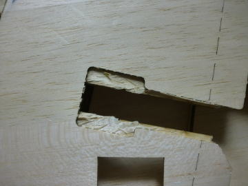 ● お次は此れ!・・・。引込脚・固定脚のユニットを取り付ける時に、必ず荷重が多大に掛かる場所なのに、ベニヤの橋渡しが取り付けられているのに・・・リブが浮いている。言い換えれば最初の着陸で左の主翼は必ず壊れます・・・。相手は初心者だし気づかないだろう・・・。あわよくば、新しい主翼セットを別売りで購入するかもしれない・・・。と、入念なる検品後に良品としたのなら、勇み足だったですな!・・・。此処は点検孔・・・。組み立ててるのがカスタム屋さんじゃなくても、DFフリークのモデラーなら必ず気づきまっせ!(笑)・・・。