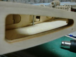 ● DFポッドを吊り下げる主翼から延びたパイロンも修復と修正が必要です。キット付属のポッド自体にDFユニットが収まらないので、一から作り直すとなると・・・現状のパイロンではDFユニットが取り付けられません。まずは・・・誤魔化しているパイロン自体の補強をせねばなりません。積層ベニヤが割れない程度に広げて、エポキシ接着剤を塗り込み補強します。次にパイロンの一部を切り取り、新しいパイロンを継ぎ足します。