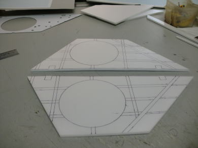 ● 垂直尾翼のベースを作ります。ベース板の厚みは、プランクシートと同じ1,5mmです。リブキャップを兼ねた幅広のプランクシートを貼り込んでいます。この上にもう一枚1,5mmのシートを被せて仮止めとし・・・ビス固定のブロック材(PVC樹脂)を接着、タップを切って翼の下面からビスで固定します。スチレン材が垂直に取り付けられていますが、此れが台座の中芯です。このスチレン材を囲む様に台座が組まれて行きます。