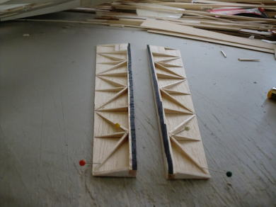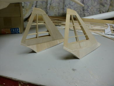 ● 垂直尾翼の取り付け台座は、床ベースとトップでは此れだけ形状が違います。よって軽量化の為のプランク作業は、この前縁付近では大変難しく成ります。こういう場合は迷わずブロック材を貼り込んで、成形した方が楽です。床ベースは完全対称に近く・・・更に翼型に沿って凹んで仕上がってます。取り付け台はプランクすると、比較的軽量ですが、かなりガッチリとした構造ですので、間違っても床ベースを定盤の上で平面で組まない事です。主翼にビス止めすると隙間が開きますし・・・無理に締め込むと主翼が変形してしまいます。