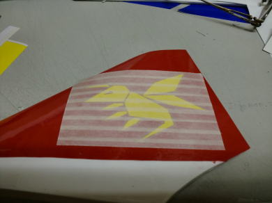 ● 無尾翼の最大の難点・・・飛行中に機体が遠くに離れてしまうと、裏か表か判断が出来なく成ります。其処で垂直尾翼をレッド・・・主翼下部の大型ベントラルフィンをブルーのフィルムで其々貼り込みました。しかし・・この貼り分けは操縦する側の最低限の安全処置です。ただ・・・ただ・・・飛行を観てるだけェ・・・のギャラリーにも楽しめるカラーデザインも欲しい所です。そこでストライプカラーの貼り分けが出来る形紙を作りました。この形紙はストライプの位置決めを行う事も出来ますし、貼り込むシールの裁断も出来ます。