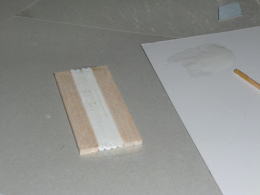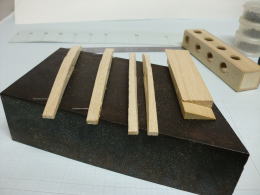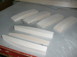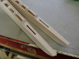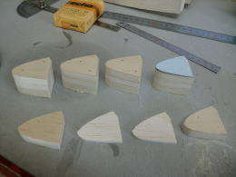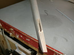 ● QRPのロッキーのキットにも付属していた、主翼の結合部の変形リブの作り方です。翼型下面を基準にリブ組すると、自然に結合部は上反角が付く様に製材してあるリブ材の事です。まずはどの位の上反角設定にするのか・・・決まったら、その半分の角度で鋸刃を傾け・・・昇降盤で画像の様な断面が三角のテーパーの棒材を切り出します。此れを二枚合わせて断面が長方形の棒材に戻します。