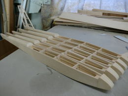 ● 簡易胴枠です。上部が丸く成ってますが、此れがスケール胴体のパーツです。見た目は普通の四角胴だったんですが、上部を半丸の胴体の形状にするだけで、グッとスケール感が増して来るんですなあ・・・。丸々胴枠数枚分を作って組み込む必要はないんです。元々が四角胴体でも充分な強度がありますので、胴体上部を半丸にすると、モノコック構造特有の軽量で強度のある胴体に成ります。