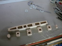● 曳航フックの台座を作っています。此れを胴体下部に取り付けて、ショックコードで曳航する為です。材料はOK模型やテトラ(丹菊モデル)から販売されているフレキシブルロッドのインナーパイプです。両社ともこのインナーパイプは、材質は違えど断面が星型です。見方によっては歯数の少ないギヤにも見えるんですが、此れを4本組み合わせて接着剤で固めると、ゴミが噛み込んで動かなくなったギヤの集合体に成るんです。