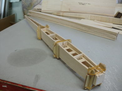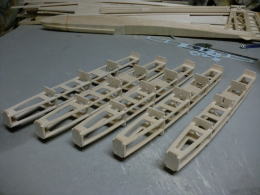 ● この内冶具工法を模型機に採用すると、こう成るんです・・・。アウトラインが既に左右対称で決まっているストリングパネルの内側に胴枠を取り付けるんですが、ストリングパネルの内部ブリッジに胴枠を接着するので、全ての胴枠が平行に固定できる上に・・・胴体の中心ラインもズレないので、軸の通った胴体を組立てる事が出来ます。通常の二枚側板の胴体に、胴枠を接着する工法では、胴体の中心軸が組立てるモデラーの技量ではズレてしまう事も有るんですけどね?・・・。この工法なら誰が組んでも仕上がりは同じ・・・。ベテランさんと初心者に技量の差が出難い構造なんです。