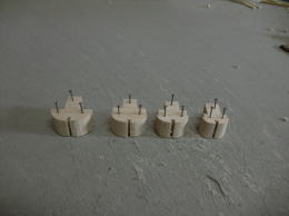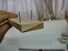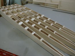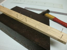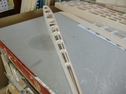 ● 其の上に翼型をトレースして釘で留めます・・・。此れを糸鋸盤で切り抜けば、分割主翼の結合面が傾いたリブが出来上がります。このリブは同じ方向ばかりだと、左側の主翼・・・もしくは右側の主翼だけしか作る事が出来ません。左右の主翼に対称で必要なので、右向きに傾斜したリブと左向きに傾斜したリブが切り出せる様に作図しないと駄目なんですなあ・・・。簡単そうにやってますが、此れってレーザー加工じゃ出来ないんですなあ・・・。だから部品の中では一番加工賃が高いんじゃないですかねえ・・・。100%手切りですしねえ・・・。(Part-2に続く)