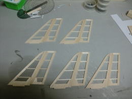 ● 尾翼は全て3mmバルサです。この手の3mmバルサは、メーカーみたいに構造を簡単にした方が部品が単純化して、数が作れる分コストダウンしても、儲けが大きく成ります。ところが、このキットを製造してどの位の時期、工房で在庫するのか・・・又は購入したお客さんがどの位の時期、自宅の工作室で保管するのか・・・によっては、部品の正確度合いが大きく変化するんです。さあ!組み立てるぞ!って時に、棒材が反ってたり湾曲してたり・・・組み上がってもヒンジラインが曲がってしまったので、個人で削る羽目に・・・。組み上がった部品が原寸図面とは合う訳が在りませんしねえ・・・。だからパーツを細分化・・・。短い部材は反り難い…反っても修正する範囲が軽微・・・だから、当工房は部品が多いんですよ。別に無駄な部品増加って訳でも無いんです。