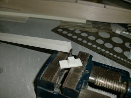 ● 本機は主翼前縁側の角ダボピンと後縁側のビス止めで主翼の固定を行います。主翼を結合する前に、プランク分込みの翼型で作図した3mmのリブを挟んでエポキシで結合しました。よって取り付ける角ダボピンも3mmベニヤ・・・。前縁側の胴枠には幅3mmのスリットを作りました。此のスリットは胴枠を突き抜けているんですが・・・。これじゃ!主翼の固定なんか出来ないじゃん!・・・。まあ、額面通りならそう言われても返す言葉は有りませんなあ(笑)・・・。