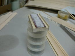 ● 後縁材も3mmバルサから切り出して、治具に嵌めこんで削り出します。隙間が三角に成ってるでしょ?・・・。要するにエルロン材の削り出しと同じなんですなあ・・・。本格的にやろうとするなら、バルサシートを掃除機で吸引して治具に密着・・・。その上を車輪付きの電動サンダーを転がして・・・って大掛かりには成るんだが、此れはメーカーの開発部時代に試作してボツった治具・・・。結局の所・・・掃除機で吸っての固定は可能だったが、バルサの材質が変わると厚みが一定しないので、結局画像みたいな手持ちのサンダーの方が正確でした。その簡素化版が此れです。
