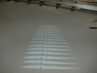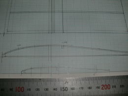 ● 本機の主翼の翼型は、邪道とも言える発想の転換から生まれました。一応綺麗な翼型では有るんですが・・・最大翼厚は6%ですし・・・。こういった抜き面の有る主翼の泣き所は、リブとリブの間の抜き面は・・・どんなに高性能な翼型を使っても、歪な状態にしか成りません。此れがフィルムの特性なので、初心者が貼ってもベテランが貼っても歪に成るんです。