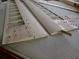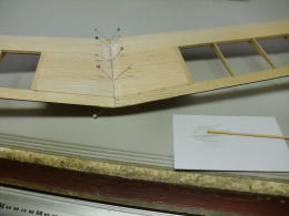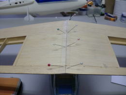 ● ベニヤのカンザシにエポキシを満遍なく塗り込んで、片方の主翼に差し込んで、はみ出たエポキシは綺麗に取り除き硬化させます。確実に左右の主翼を結合させるなら、カンザシの埋め込みは二回に分けた方が確実です。硬化したらもう片方のカンザシにもエポキシを塗り倒し、接着する翼面にもエポキシを盛り・・・左右の主翼を結合します。エポキシがはみ出す位なら、確実に全面に接着剤が行き渡っています。この状態をマチ針で固定して硬化させましょう。