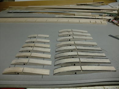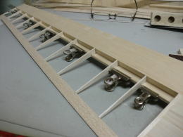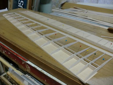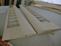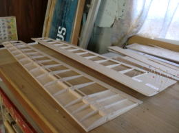 ● カラクリは意外と簡単ですよ。上面のスパー位置までがプランクする面です。其処から後縁材までが抜き面なんですが、此処も直線なんですなあ・・・。直線の面が構造体に成ると・・・平面でしょう?・・・。平面にフィルムを貼り込むんだもの・・・凹む要素が無いんですなあ・・・。こういう翼型を層流翼って言うんですが、実物の大戦機で多く使われた手法なんですよねえ・・・。前線基地に複雑な加工重機なんて持ち込めないでしょう・・・。