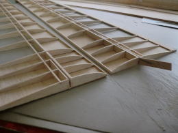 ● 上記のロッキーの主翼・・・リブ間のカンバ―が裏返しって事は、浮きはあまり良くないって事です。もし!ゲッチンゲンの能力を最大限に引き出したかったら、全面をプランクすれば完全なる高性能なゲッチンゲン翼になります・・・。しかし全面プランクにした分、全備重量が確実に大きく増えますので、翼面荷重の数値も上がり・・・グランドの滞空競技においては、上位入賞は難しく成るでしょうねえ・・・。尚・・・模型機の翼面荷重とは・・・100平方センチメートル(10×10センチ)が受け持つ機体の重さを表しています。この数値が少なければ機体は軽く・・・数値が大きければ機体は重いと言う事ですので、動力機ならばグローエンジンやブラシレスモーターのサイズが決められますし・・・、翼面荷重の数値を最初に設定すると、機体のサイズと使用する材料の吟味・・・構造などの設計に必要な諸元が全て決められます。取り敢えず機体を完成させてから、推力装置のサイズを決めようとするから推力不足で飛行機が飛びませんでしたああああ・・・って事態にも遭遇するんですよ。まあ・・・バルサキットやら自作機やらと自分で作ってると、最終的にはこの翼面荷重が諸元の中で一番重要な数値だって理解出来ます。