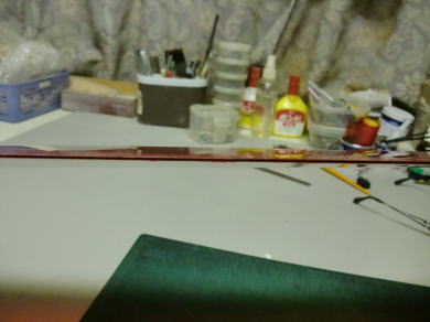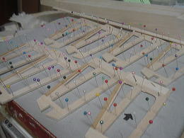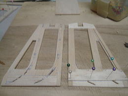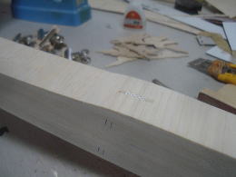 ● 画像の垂直安定板の最終的な厚みは、6,5mmです。画像はその中芯材の2mmバルサ・・・。其処に何やら二本の溝が切って有るでしょう・・・。この溝の幅は2mmです。この溝の中に外直径2mmのパイプが埋まります。パイプの中を通るのは、テグスのワイヤー・・・。この機構はテグスワイヤー二本で、垂直安定板の上部に載せるフライングスタビライザーの作動をコントロールします。両引きなのでピッチ軸のガタが出ません。その為の構造なんですよ。