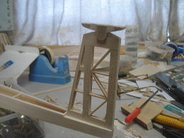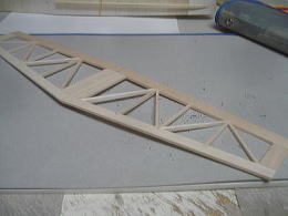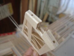 ● 垂直安定板の二本の支柱の中に、テグスワイヤーのガイドパイプが内蔵されて、先端から覗いています。この垂直安定板は抜き面が有るのでひ弱に見えますが、生地完成の状態でも捻じれない程の強度を持っていますので、被覆はフィルムで充分なんです。この垂直安定板もガイドパイプ以外は全てバルサです。言い換えるなら・・・ノイズレスのガイドパイプを埋め込む事で、構造強化の一役を担っている側面も有るんですよねえ・・・。此れもテールヘビー対策・・・。
