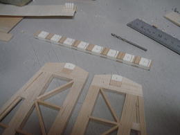 ● 本機の前縁は二層です。プランク材の前小口も接着剤を塗り込んで、3mmバルサの外側前縁材を貼り込みます。前縁材の二層構造は、元々がF3Aスタント機の構造です。加藤無線(MK)のF3Aのキットは、殆どのクラスがこの二層前縁です。此れが一層前縁だと、削り過ぎてプランクシートに孔が開く場合もありますが、この二層前縁の場合・・・削り過ぎて孔が開く事が有りません。もう一つのメリットなんですが、一層前縁の場合・・・接着した筈のプランクシートが、削ってる最中に浮き上がる場合が有ります。接着剤の塗り込みの甘かった部分が浮き上がってしまうんですなあ・・・。しかし・・・二層前縁は、プランクシートの前小口も一緒に接着剤を塗り込むので、剥がれてしまうという悲劇は起き辛いです。二層前縁の方が綺麗に削れるというメリットも追加しておきましょう・・・。