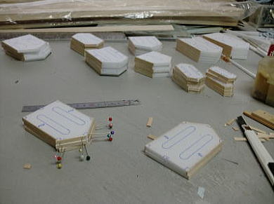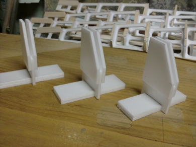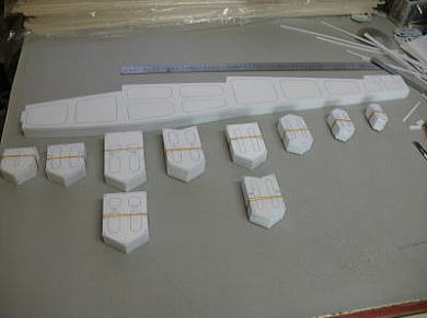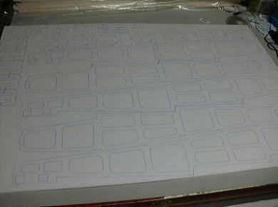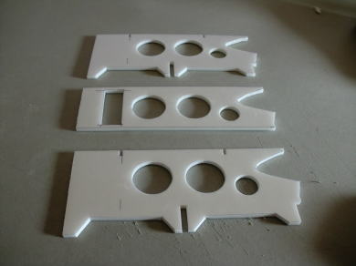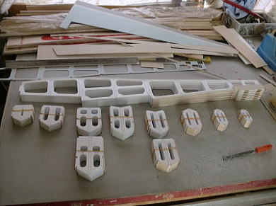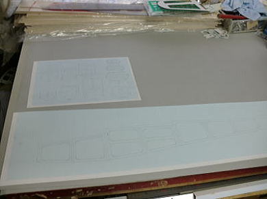 ● 何れ別機種への汎用も考慮しましたので、最初から5機分の材料を準備し、部品を切り出しました。厚さ5mmのスチレンシートは、中身は通常の発泡材ですが、両表面は熱を加えた後、急激に冷却して有るので極めて滑らかです。この処理によってシート自体に指向性を与えています。よってこのシートを胴枠とキールに使うと、圧縮とせん断には大変強く・・・胴体内部の構造体には打って付けの材質だと思います。