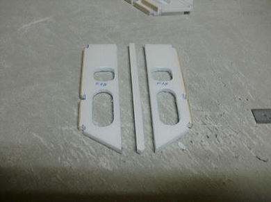 ● ついでにコクピット兼機首のメカハッチも材料取りしてしまいます。真ん中の二本の成形ブロックがコクピットの材料です。左右二本のブロックを繋いで一個と成ります。一度切り離した両端のブロックを、もう一度両面テープで中のブロックに貼り付けて、直方体のブロックに戻します。
