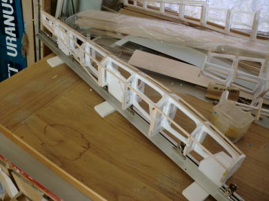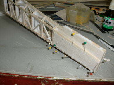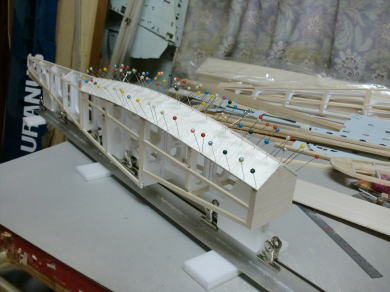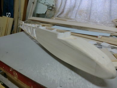 ● パイロン後部の成形です。実機鷹号と同じ様に天板を取り付けて、側面はバルサシートでプランクしました。この辺は実機のスケール通りに綿密に作らなくても良いですよ。本機鷹号は最初からセミスケール設定ですから・・・。一条氏の設計されたガルモデルの数々のスケール機を、完全スケール機だ!・・・と評したブログの管理人さんが居ました(笑)・・・。ガルモデルから販売されていたグライダーの数々は、全て一条氏が再設計して作り易く飛ばし易くしたセミスケール機ばかりです。だから・・・作れるモデラーが沢山居ましたし・・・飛ばせるモデラーも沢山居たんですよ。実機グライダーの完全スケールにするには、バルサで表現するには無理が在るんですよねえ・・・。だから形を崩してセミスケール化・・・。
