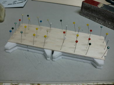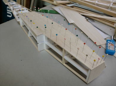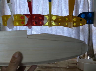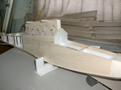 ● パイロンと胴体には隙間が残っています。此処を塞がないとパイロンが胴体上で安定して固定されません。コクピット後部のヘッドパネルを嵩増しで成形・・・。其れに沿う様に斜めの胴枠を追加して、バルサシートを横目で貼り込みました。横目で貼ると木目が支柱と成るので、パイロンが安定します。