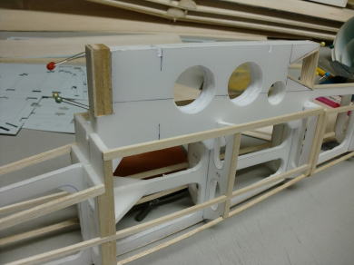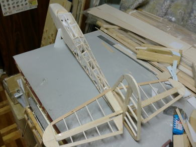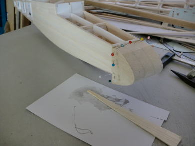 ● キールフレームの周囲・・・胴枠の周囲・・・必要な箇所には全て、短冊加工の1,5mmバルサを貼り込みます。後部胴体には垂直尾翼のジョイント受けと補強を兼ねたバルサシートを貼り付けます。余計な構造だと受け入れられないモデラーも居るとは思いますが、胴体の中心が直線なら・・・必ず左右が対称のカーブを有する胴体が組み上がるという法則なので、有効だと思うモデラーのみ実践して下さい。
