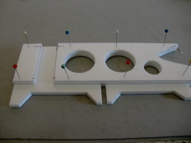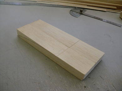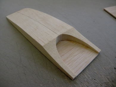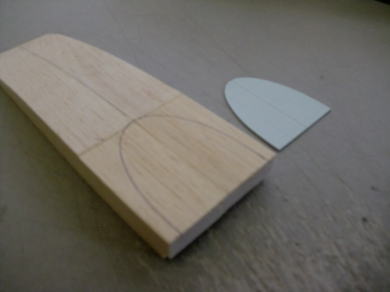 ● 胴体の機首メカ室の形状に合わせて、コクピットを成形します。直方体に戻したのは基準を採り易くし・・・糸鋸盤での切り出し加工をし易くする為です。今度はコクピットのパイロットの搭乗部分を切り出します。形紙を使ってボールペンでトレースし、糸鋸盤で切り抜きます。