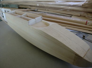 ● 機首の先端にブロックで形成するノーズコーンをエポキシ接着剤で貼り込みます。余った接着剤は、ノーズコーンを貼り込んだ機首先端の胴枠と側板の接する角に盛り付けて補強します。この角には、他の箇所で使ったエポキシの余りは、全て盛り付けると良いですよ。昭和の黎明期のモデラーなら、当たり前に行っていた技術です。