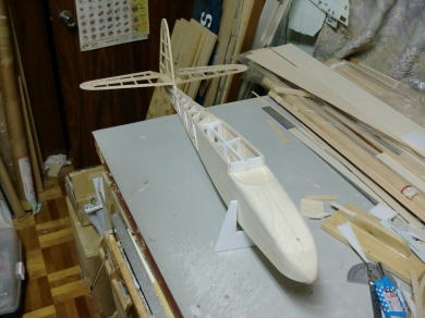 ● 本機鷹号の胴体は、当工房オリジナル設計である(Early Bird Ⅲ型)と共通です。実は尾翼も共通なんです(笑)・・・。別に使い回してる訳では無いんですが、元々アーリーⅢ型が、鷹号の胴体を参考に設計したので・・・こういう使い回しが出来るんです。胴体内部構造にはスチレン製のキールフレームを採用しました。糸鋸盤の使用を極力限定し、作り易い構造を心掛けてみました。胴体の肉抜きが極端なんですが、このキールフレームに二枚側板のバルサシートで構成される胴体の為・・・作り易さと基準を採る機能以外、何の意味も成しません。むしろ・・・無くても良いんですが、後部胴体がトラス組なので基準は必要なんですよねえ。
