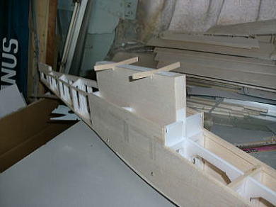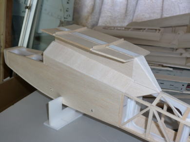 ● 胴体先端の機首ブロックの上部と。メカハッチの先端に隙間が見えますが、このハッチはビス止めなので、この隙間には薄いベニヤを貼り付けて、タッピングビスが捻じ込める様にしました。このネジを締め込んで、メカハッチを固定出来てから、機首廻りの全体的な削り作業を行います。一部後部胴体のトラス棒も胴枠間の対角上にバルサの棒材を取り付けて行きます。