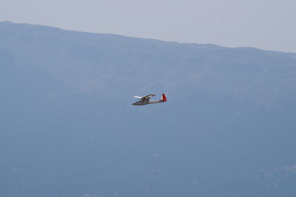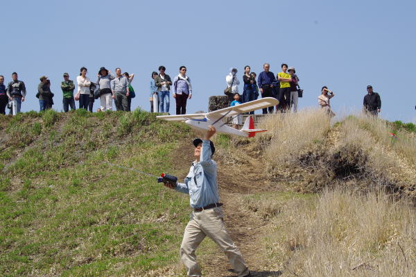 ● ところがスロープサイトだと・・・操縦者の身長は、落差の分だけ増えるので数百メートルの身長の目線での水平飛行ですので・・・大型機を飛ばしても地面は遥か下方です。グランドでは機体を180度ひっくり返さないと、完全なる機体の上面は見えませんけど、スロープフライトなら上から見下ろして飛ばせるんですよねえ・・・。此の感触に気づいたモデラーさんは、スロープフライトの虜になって行くんですよ。