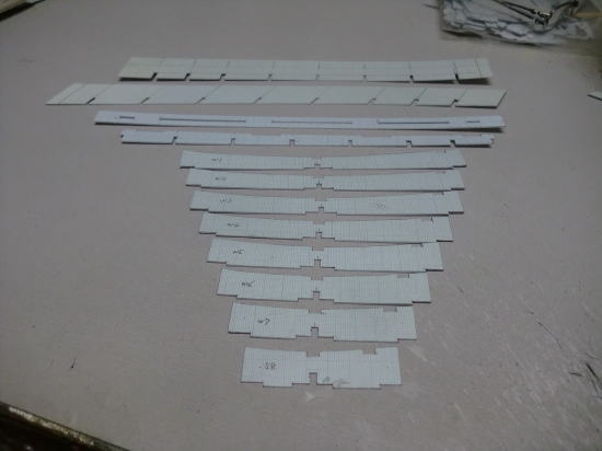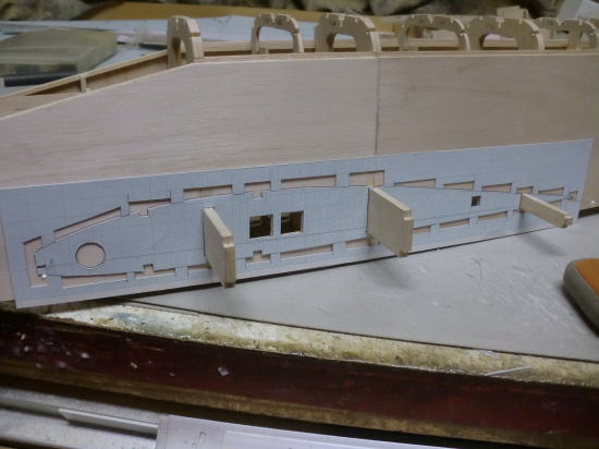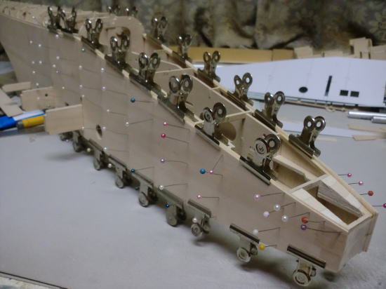 ● 胴体側面への貼り込みには木工白ボンドを使いました。リブの周囲をマチ針を刺し込んで仮止めし、硬化を待ちましょう。胴体側面のカーブに合わせてリブも湾曲して貼り込んでますが、カーブした分寸法が短く成るので、正確には貼れてないのですが、リブの前後で其々0,3mmほどしか短く成りません。よって、テーパー比率に合わせて作図し、普通に貼り込んでも支障は出ません。しかし、其れでも綿密では無いので、その辺りが目について許せない!って思うモデラーさんは、別のもっとハイテク機器を使って正確に切り出して貼り込みましょう。