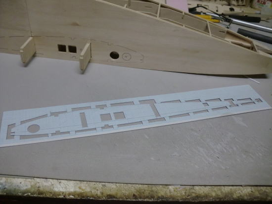 ● 切り出した1番リブを実際に取り付ける際は一部切り取らなければなりません。何故最初からそうしてないのか・・・。此れはですなあ・・・切り出す際の強度維持が必要だからです。今回作ったのは厚さ2mmのハードバルサです。よく切れるカッターナイフの刃先で切り込む場合でも、細くしか残せない部分が折れてしまう場合もあるんです。よって、まずは枠抜きして、全部抜けたら調整の加工を行い最終的に切り取りました。
