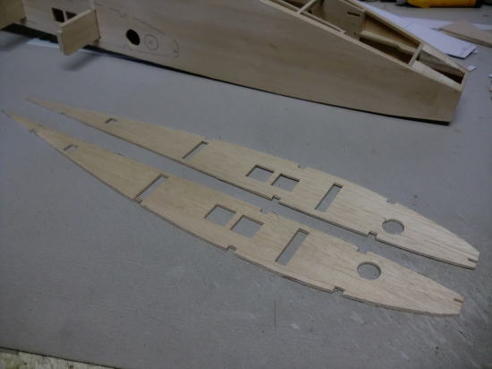 ● 縦目と横目の貼り合わせの合板にする側板材は、ある意味頑丈な側板材と成るんです。更に間に塗り込む接着剤がある程度の重量物にも成るので、テールヘビーの軽減にも役立ちますし、強度の高い構造体にする事が出来ます。骨の要る加工には成りますが、仕上がる胴体の構造体が大変頑丈であると共に、作る手順において・・・作り手が納得した上での作業を進める事が出来るので、ストレスの軽減にも役立ちます。