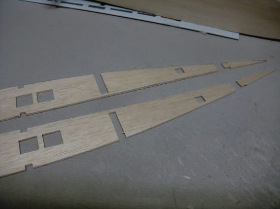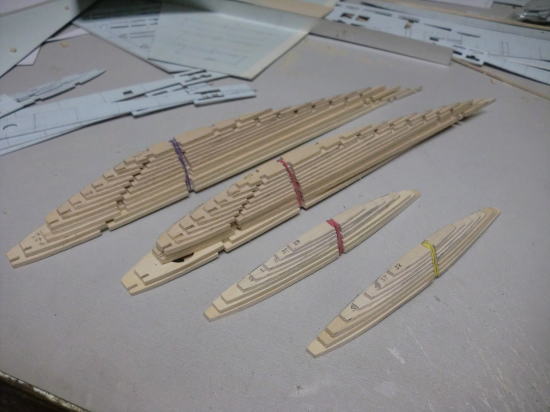 ● 前部胴体側板の工作を行います。画像の其々対の側板材の厚みは1,5mm・・・。厚みは同じですが木目の方向が其々対で違います。本機の胴体の側板は、重心位置付近で前部胴体を3mm・・・後部胴体を2mmで構成しています。厚さ3mmの側板材を500mm程の区間で、半分以下に絞るのは大変難しい・・・。胴枠に確実に貼り付けるには聊か難儀ではあるんです。仮に厚みが1,5mm・・・しかも、木目が縦目ならば、このカーブにも柔軟に対応できます。二層目は正規の横目に成るので、仕上がりの違和感は起こりません。