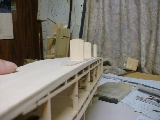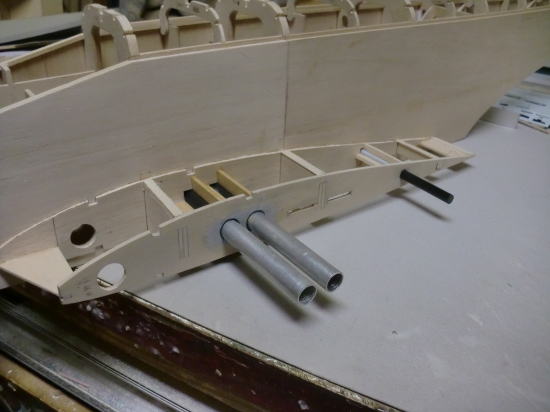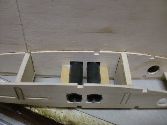 ● 実際にパイプを通して、位置を確かめてからパイプを固定しています。画像の場合はまだ瞬間接着剤によるパイプの仮止めの状態です。パイプ横の補強板は3mmのヒノキの平材を同じく瞬間接着剤で仮止め程度に貼り込んでます。最終的には目張りをする様に、周囲の隙間を埋めながら作業を進めて行きます。別にパイプのみを接着剤で固めても良いんですが、此れは私の個人的な好みです。