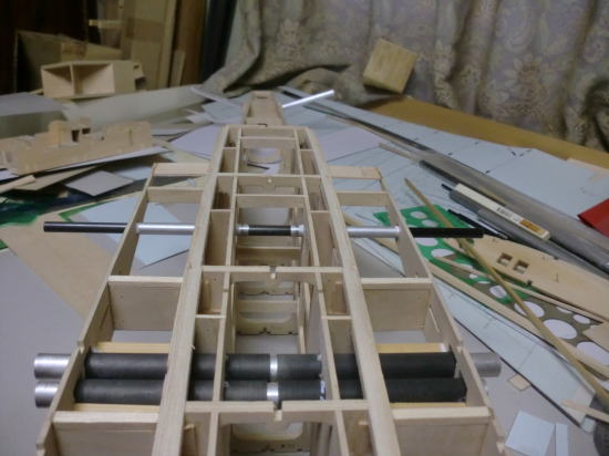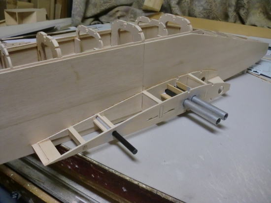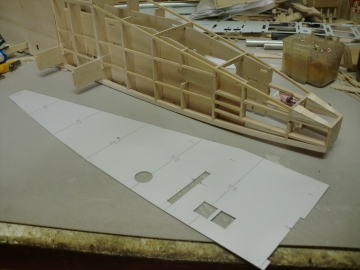 ● フライングスタビのリブ材は全部で8枚使います。此れをカンザシ受けのアルミパイプ一本で支えなければなりません・・・。ひ弱な材質と構造では駄目なんです。胴体側のリブ3枚は3mmベニヤで構成してますが、4番リブから翼端側の8番リブまでは2mmのハードバルサで構成しています。プランクシートはVEGA同様に有りませんが、多分フィルムを貼り込んだら驚くほど頑丈なスタビに成ります。更に比較的軽量です。