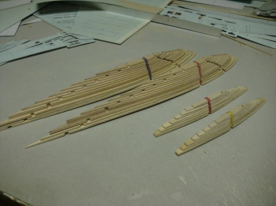 ● 主翼に使う全リブとフライングスタビのリブは切り出して有ります。見た目は普通のリブ材なんですが、実は・・・全てハードバルサなんですよ。模型飛行機・・・其れも無動力のスロープグライダーのリブ材にハードバルサだあ?・・・。普通ならネット上の自作モデラーなら誰も使わないであろう、本当にガチガチな材質のハード系バルサを使いました。こんなに細いのに、加工には糸鋸盤使ったんですよ(笑)・・・。見た目大変綺麗でしょう・・・。気にする程の重量増加には成りませんでした。むしろ、加工はし易かった部類に入ります。