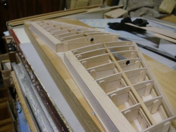 ● 本機の主翼は高テーパー比に属し、更に後退角の付いた形状です。よって失速を遅らせる為の捻り下げを付けなければなりません。リブ組み状態の主翼を両手で掴んで捻ると、メインスパー上を基準に主翼が捻じれる事が解ります。その度合いは、上下のメインスパーで約1mm程度のズレなんですけど・・・。この事から、捻り下げの専用治具を作る場合、後縁材とメインスパーまでの枠状の治具を作れば設定した捻り下げの治具を作る事が出来ます。