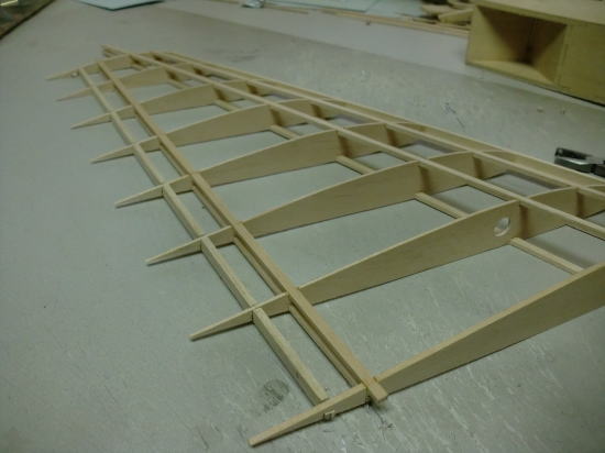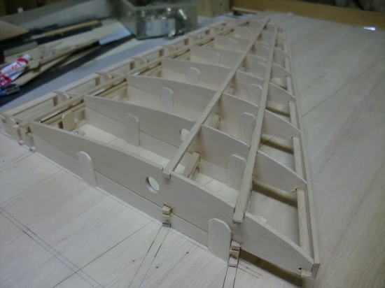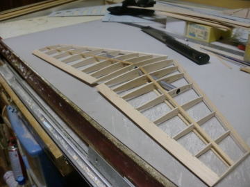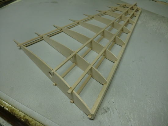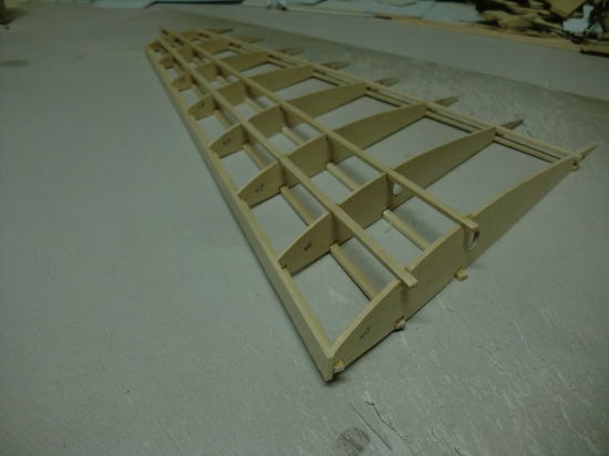 ● 左右のリブ組み翼を治具から外すとこんな案配・・・。普通のリブ組み翼なんですが、一つ違うのは・・・便乗組の博士さんも自作モデラー諸氏も、はたまたカスタム業の職人さんも使わないだろう、ガチガチのオールハードバルサだけで構成されたリブ組み翼です。さぞかし重い翼なんだろうなあと思われがちですが、オールベニヤとヒノキの棒材で構成された主翼よりも遥かに軽量です。