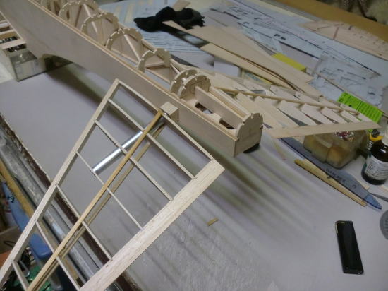 ● 外翼(アウターウィング)の組み立て中です。世の中のジェダイマスターな自作モデラー諸氏の治具とは少し違いますね。多分・・・非難轟々でしょうなあ・・・。お仲間同士の密な掲示板やら飛行場での会話やら、ツッコミ所満載の治具ですからねえ・・・。前縁補助材とメインスパーの中間に補助スパーが入れて有るんですが、この位置までしか治具が無いんです。長年自作やってると・・・正確な組み立てを損なわない手抜き所が見えて来るんです。