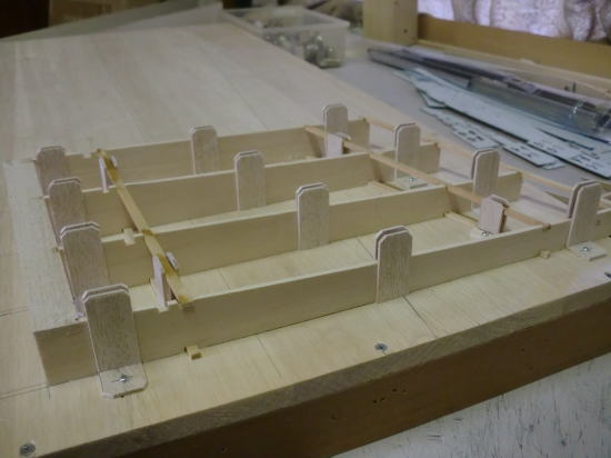 ● 外翼(アウターウィング)の治具を製作します。画像はリブ材を載せる台座の部材です。全てハードバルサなので、糸鋸盤から切り出しました。たとえ2mmバルサであっても、二枚重ねで4mmしか無いんですが、ガッチガチのハードバルサなら普通に糸鋸盤が使えるんです。定盤上にトレースした位置に部材を取り付けているんですが、このストリング材もハードバルサです。横に付いているペグもハードバルサ・・・、全てが取り外せる仕様にしました。